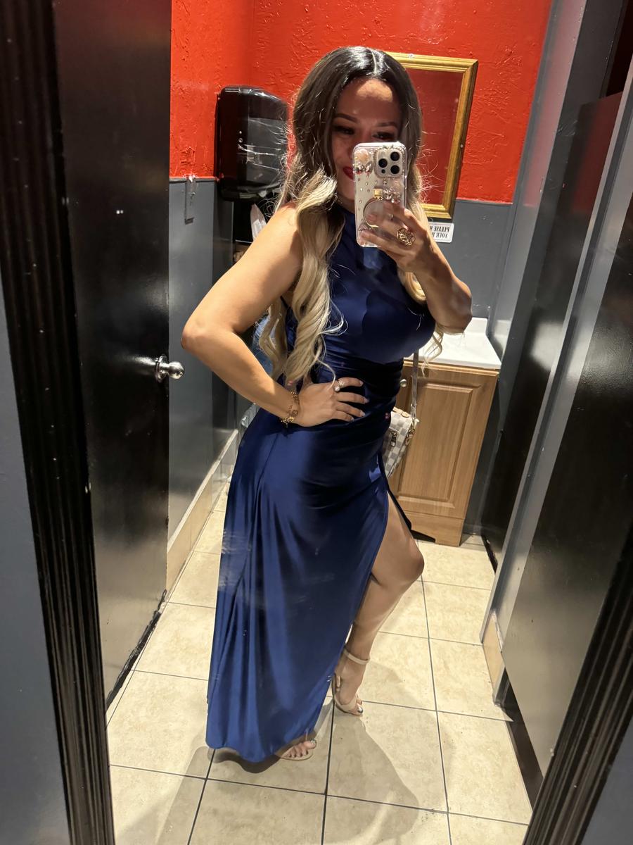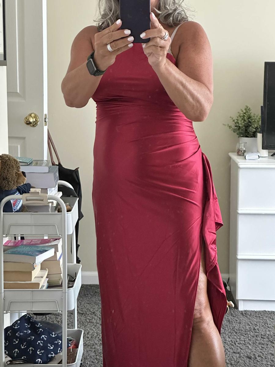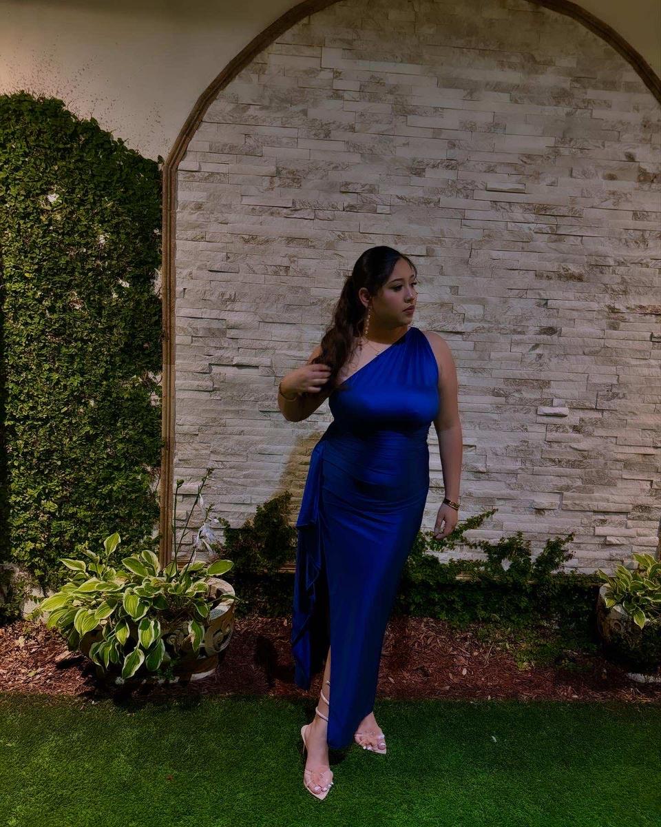 Serving drama in all the right ways. This one-shoulder maxi stuns with draped details, a leggy high slit, and a back strap you can tie just how you like it. Total showstopper energy.